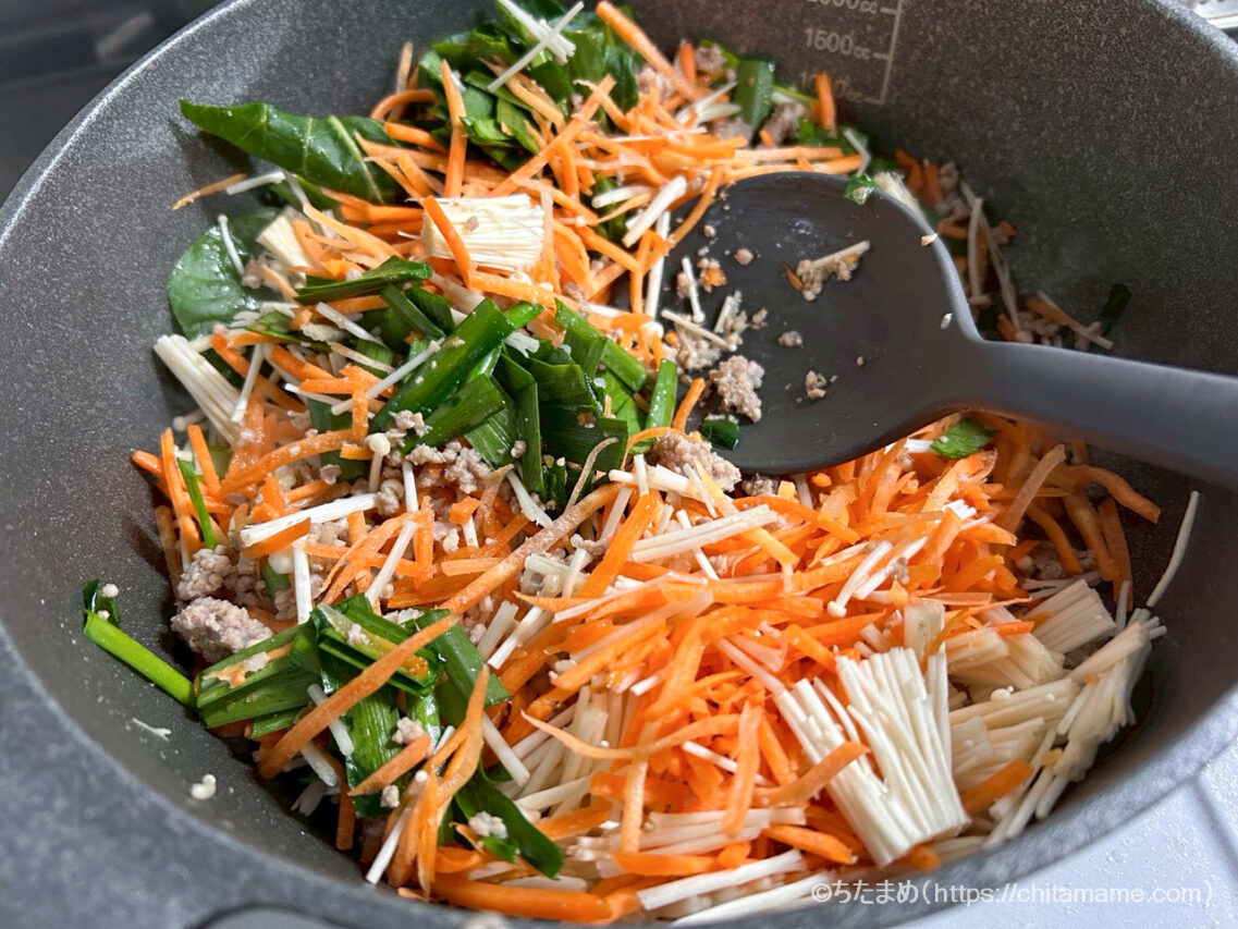 ビビンバの良いところは、豆板醤を後入れできる点。子ども分を先に取り分けて、大人は辛口にできるのが助かりました。