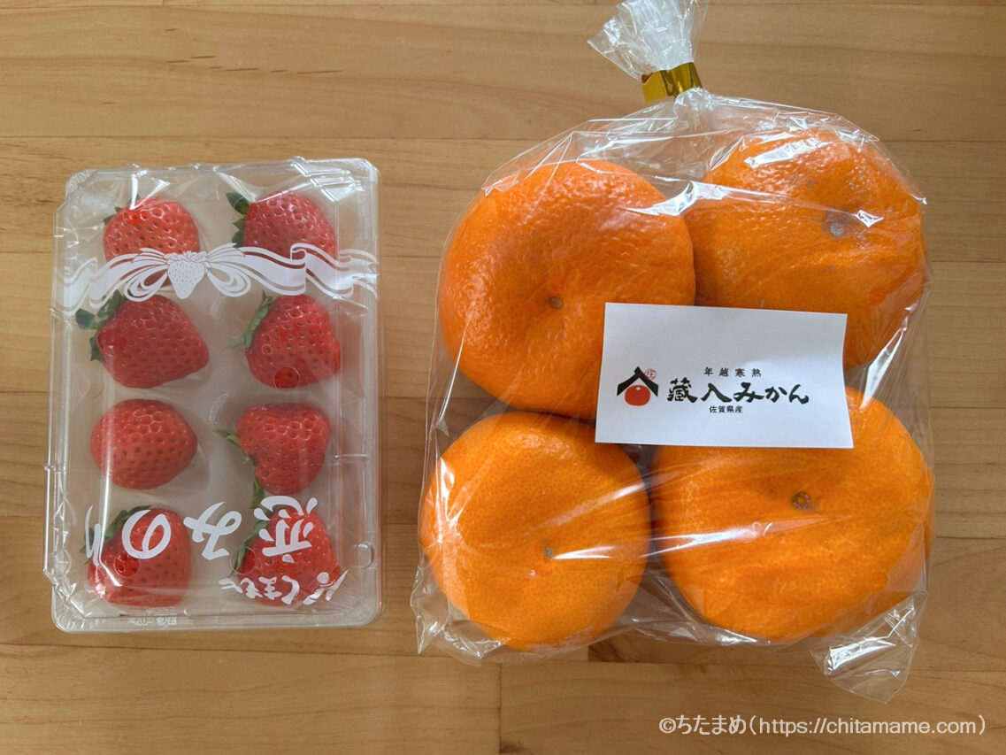 今回届いた全内容(写真)キット+果物+おやつが入っていました。