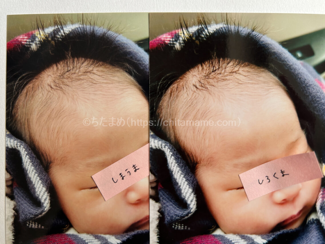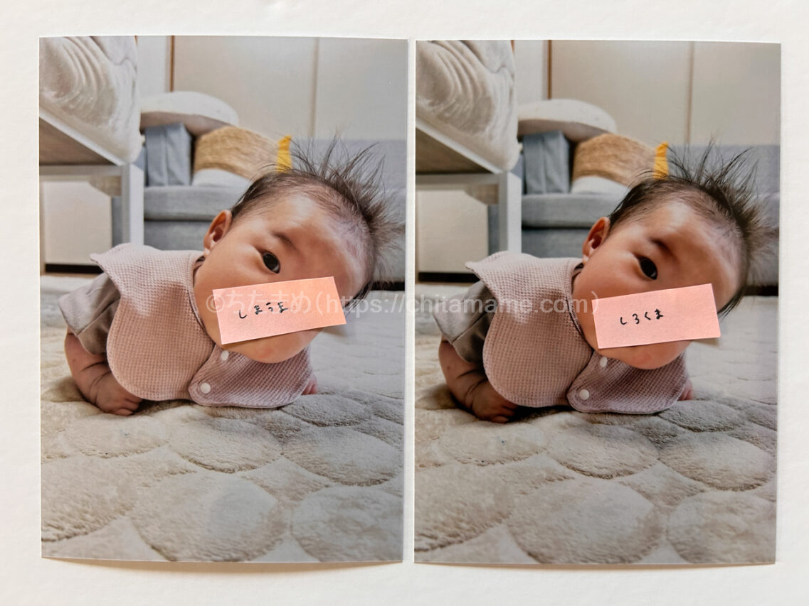 大きく問題があるわけではありませんが、今回の比較では子どものアップ写真で気になる部分がありました。赤ちゃん特有の肌感や目元の自然さは、しまうまプリントの方が好印象でした。
