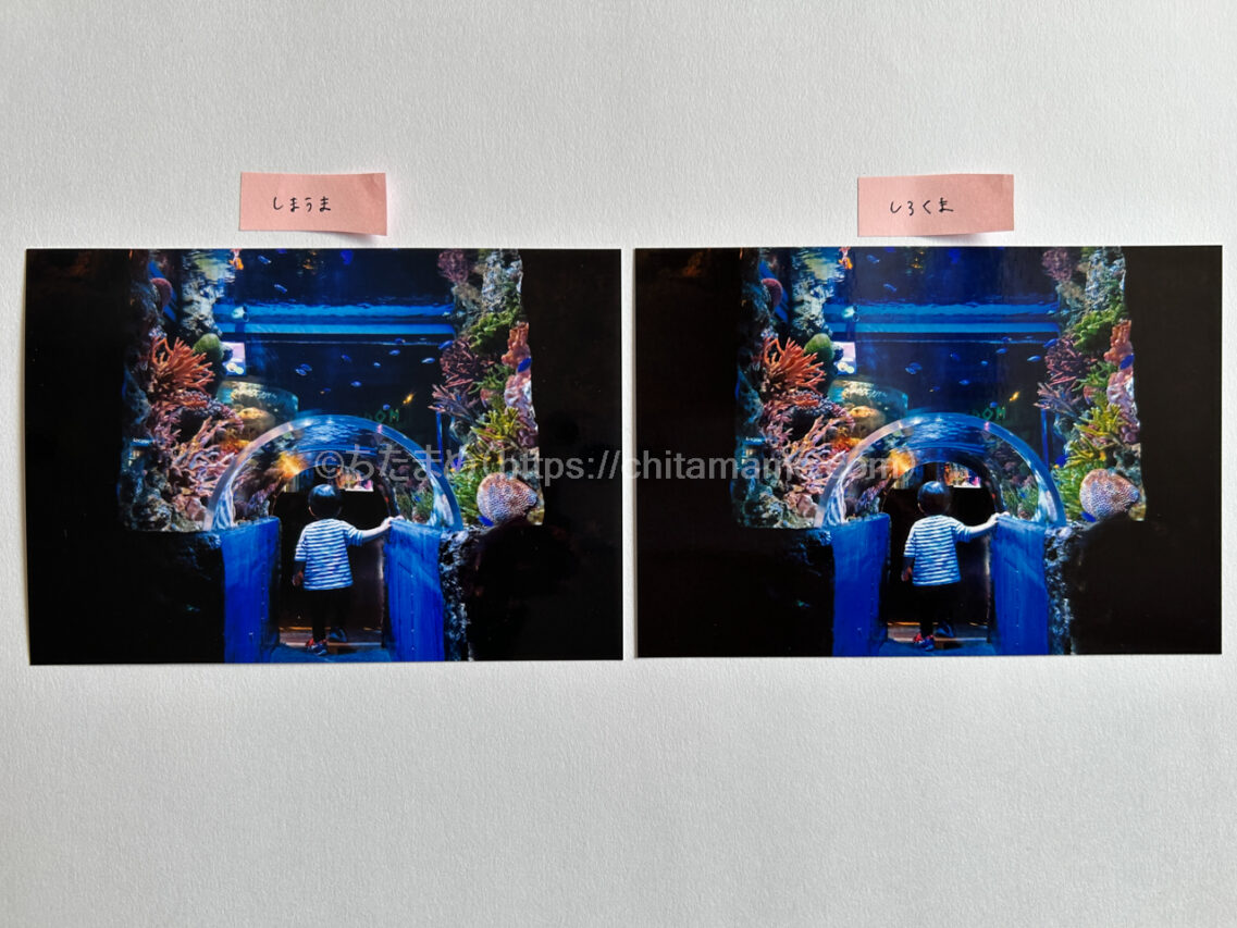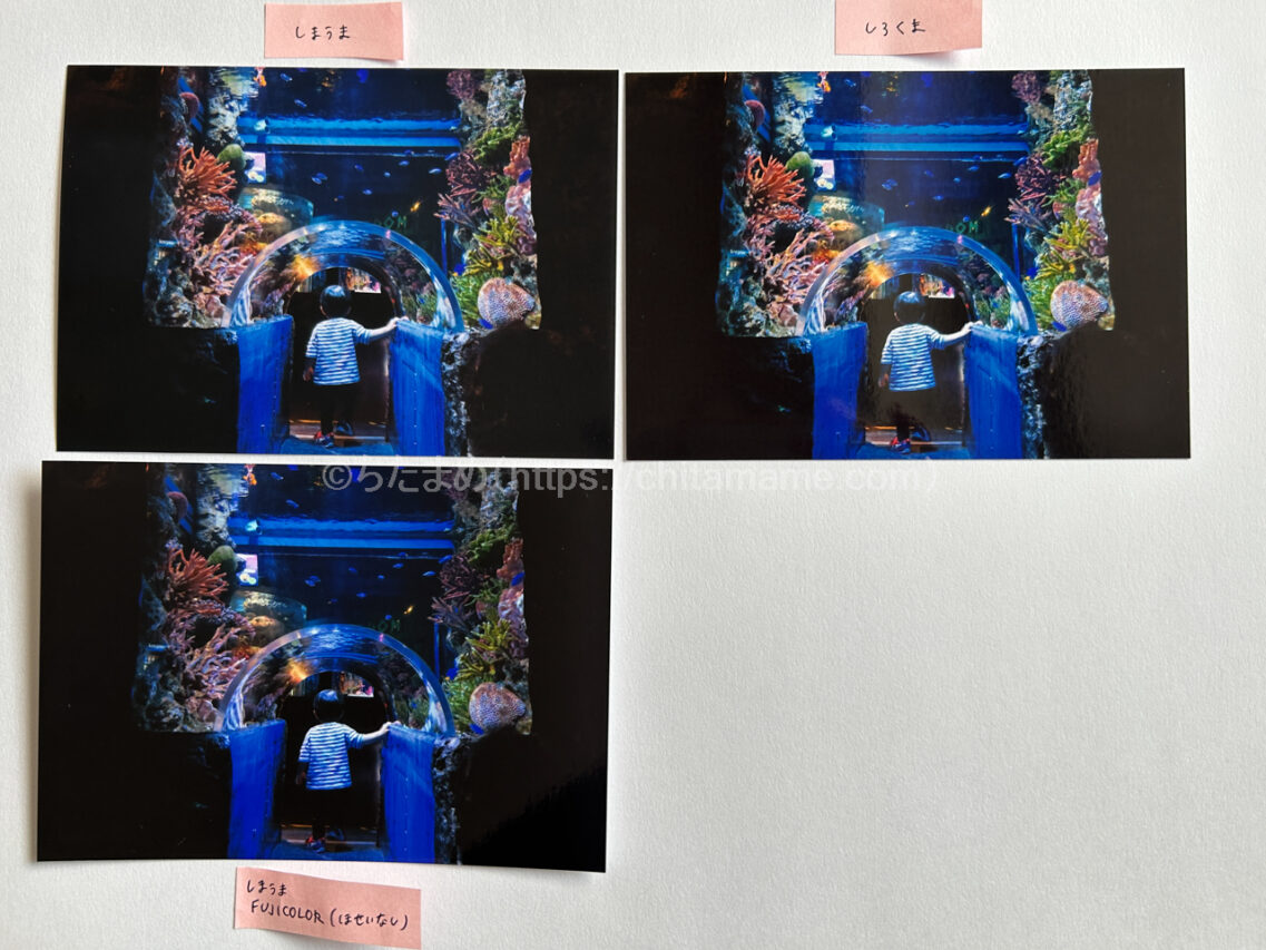 とはいえ、水族館などの黒が多い写真はしまうまプリントでもランクを上げた方が満足度は高かったです!